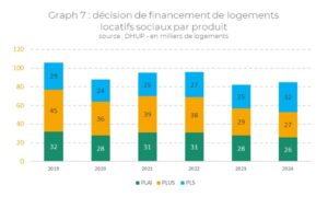 La demande de logements sociaux atteint, quant à elle, des records : 2,7 millions de ménages en demande en 2024. Mais les contraintes qui pèsent sur les bailleurs sociaux demeurent encore trop fortes pour envisager de dépasser le plafond des 100.000 logements financés, pourtant annoncé chaque année comme objectif (graphique 7 ci-dessous).