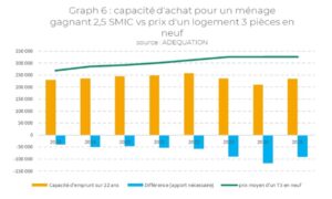 Les réflexions sur les solutions d’accès au logement via des statuts d’occupation hybrides, entre le locatif et l’accession classique, se sont imposées (sans être complètement nouvelles) en lien avec l’effondrement des capacités d’achat des ménages en 2022 (graphique 6 ci-dessous), lié à la hausse brutale et forte des taux (de 1,1% en janvier 2022 à 4,11% en janvier 2023).